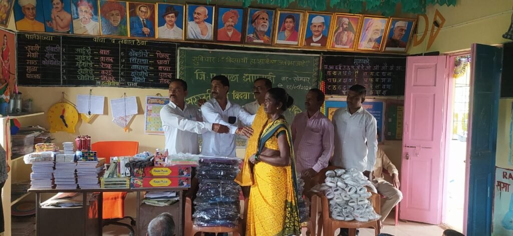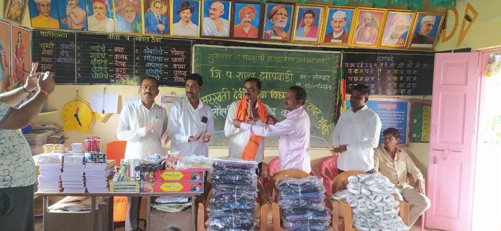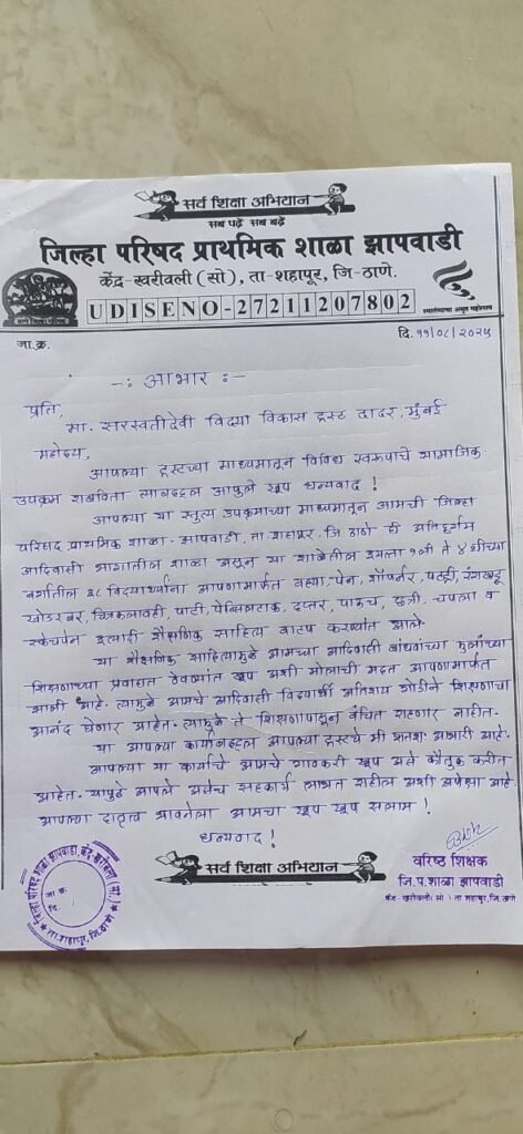 सरस्वती देवी विद्या विकास ट्रस्ट दादर, मुंबई यांच्या सहकार्याने झापवाडी शाळेतील मुलांना शैक्षणिक साहित्य मिळाले.