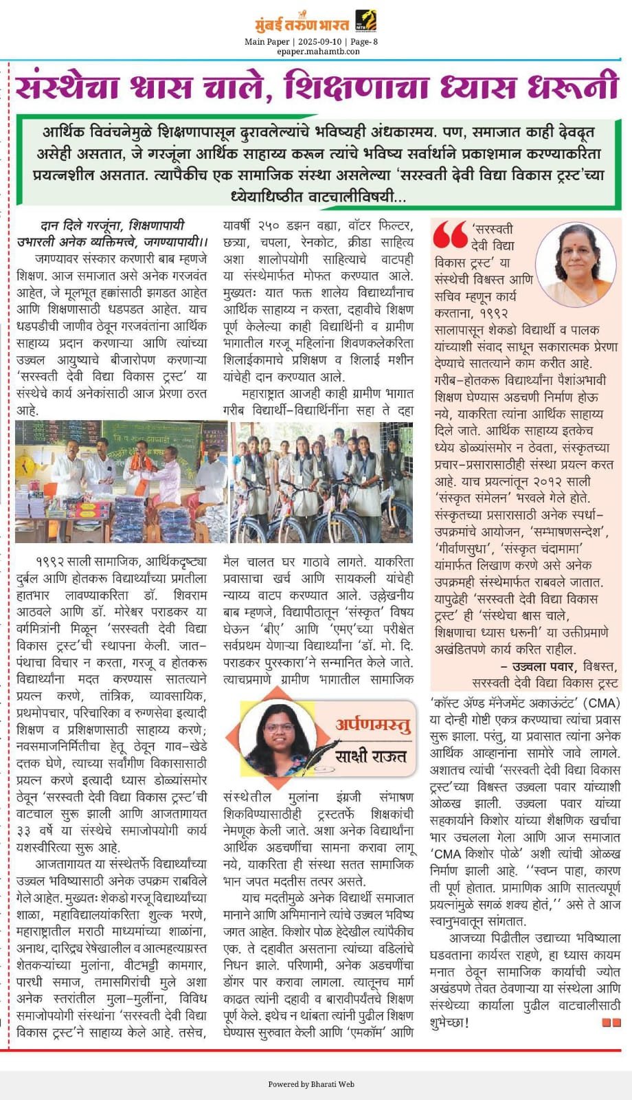 Top 5 This Week ” तरुण भारत ” वर्तमानपत्राने ट्रस्टच्या कार्याची दखल घेतली. Featured Riva Amle - March 24, 2026 ” सेवाश्रम ” चे मा.श्री. सुरेश राजहंस यांनी ट्रस्टविषयी व्यक्त केलेली कृतज्ञता. Blog Riva Amle - March 24, 2026 आदर्श शिक्षक पुरस्कार विजेत्या मा. मंजूषा बुरुजवाले यांनी ट्रस्टच्या कमाची केलेली प्रशंसा. Featured Riva Amle - March 24, 2026 श्री. किशोर पोळ यांची यशोगाथा. Featured Riva Amle - March 24, 2026 ” पहिलं पाऊल ” संस्थेचे मा.श्री. संदेश सारंग यांनी ट्रस्टविषयी व्यक्त केलेली कृतज्ञता. Blog Riva Amle - March 24, 2026 Related Posts ” तरुण भारत ” वर्तमानपत्राने ट्रस्टच्या कार्याची दखल घेतली. Featured आदर्श शिक्षक पुरस्कार विजेत्या मा. मंजूषा बुरुजवाले यांनी ट्रस्टच्या कमाची केलेली प्रशंसा. Featured श्री. किशोर पोळ यांची यशोगाथा. Featured ” सक्षम फाऊंडेशन ” चे मा.श्री. सुनील हेरोडे यांचा समाजसेवेबद्द्ल गौरव व आर्थिक मदत. Featured ‘माध्यमिक विद्यालय,सुकदर’ या शाळेतील शिक्षकांनी व्यक्त केलेली कृतज्ञता. Featured ट्र्स्टचे शैक्षणिक मदत कार्य Featured तरुण भारत दैनिकातील वृत्त Author: Riva Amle March 8, 2026 Less than 1 min.read FacebookTwitterPinterestWhatsApp Previous articleआमच्या उज्ज्वलाताईNext articleट्र्स्टचे शैक्षणिक मदत कार्य Riva Amle LEAVE A REPLY Cancel reply Comment: Please enter your comment! Name:* Please enter your name here Email:* You have entered an incorrect email address! Please enter your email address here Website: Save my name, email, and website in this browser for the next time I comment. Popular Articles ” तरुण भारत ” वर्तमानपत्राने ट्रस्टच्या कार्याची दखल घेतली. ” सेवाश्रम ” चे मा.श्री. सुरेश राजहंस यांनी ट्रस्टविषयी व्यक्त केलेली कृतज्ञता. आदर्श शिक्षक पुरस्कार विजेत्या मा. मंजूषा बुरुजवाले यांनी ट्रस्टच्या कमाची केलेली प्रशंसा. श्री. किशोर पोळ यांची यशोगाथा. ” पहिलं पाऊल ” संस्थेचे मा.श्री. संदेश सारंग यांनी ट्रस्टविषयी व्यक्त केलेली कृतज्ञता.