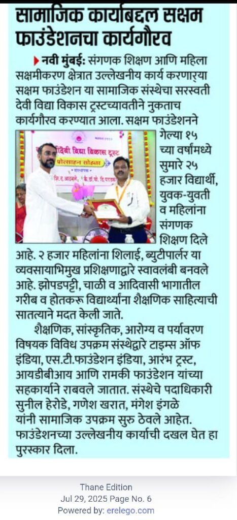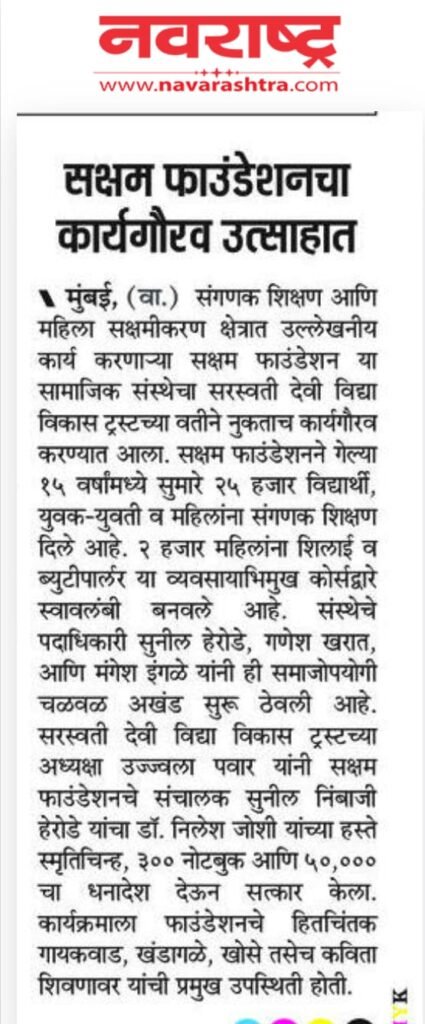 Top 5 This Week ” तरुण भारत ” वर्तमानपत्राने ट्रस्टच्या कार्याची दखल घेतली. Featured Riva Amle - March 24, 2026 ” सेवाश्रम ” चे मा.श्री. सुरेश राजहंस यांनी ट्रस्टविषयी व्यक्त केलेली कृतज्ञता. Blog Riva Amle - March 24, 2026 आदर्श शिक्षक पुरस्कार विजेत्या मा. मंजूषा बुरुजवाले यांनी ट्रस्टच्या कमाची केलेली प्रशंसा. Featured Riva Amle - March 24, 2026 श्री. किशोर पोळ यांची यशोगाथा. Featured Riva Amle - March 24, 2026 ” पहिलं पाऊल ” संस्थेचे मा.श्री. संदेश सारंग यांनी ट्रस्टविषयी व्यक्त केलेली कृतज्ञता. Blog Riva Amle - March 24, 2026 Related Posts ” तरुण भारत ” वर्तमानपत्राने ट्रस्टच्या कार्याची दखल घेतली. Featured आदर्श शिक्षक पुरस्कार विजेत्या मा. मंजूषा बुरुजवाले यांनी ट्रस्टच्या कमाची केलेली प्रशंसा. Featured श्री. किशोर पोळ यांची यशोगाथा. Featured ‘माध्यमिक विद्यालय,सुकदर’ या शाळेतील शिक्षकांनी व्यक्त केलेली कृतज्ञता. Featured ट्र्स्टचे शैक्षणिक मदत कार्य Featured तरुण भारत दैनिकातील वृत्त Featured ” सक्षम फाऊंडेशन ” चे मा.श्री. सुनील हेरोडे यांचा समाजसेवेबद्द्ल गौरव व आर्थिक मदत. Author: Riva Amle March 24, 2026 Less than 1 min.read FacebookTwitterPinterestWhatsApp Previous article” माध्यमिक विद्यालय – वाघोशी ” , या शाळेला ९ सी.सी.टी.वी कॅमेरा ची मदत.Next articleमा. जीविका गुप्ता यांनी ट्रस्टच्या कार्याविषयी केलेली प्रशंसा. Riva Amle LEAVE A REPLY Cancel reply Comment: Please enter your comment! Name:* Please enter your name here Email:* You have entered an incorrect email address! Please enter your email address here Website: Save my name, email, and website in this browser for the next time I comment. Popular Articles ” तरुण भारत ” वर्तमानपत्राने ट्रस्टच्या कार्याची दखल घेतली. ” सेवाश्रम ” चे मा.श्री. सुरेश राजहंस यांनी ट्रस्टविषयी व्यक्त केलेली कृतज्ञता. आदर्श शिक्षक पुरस्कार विजेत्या मा. मंजूषा बुरुजवाले यांनी ट्रस्टच्या कमाची केलेली प्रशंसा. श्री. किशोर पोळ यांची यशोगाथा. ” पहिलं पाऊल ” संस्थेचे मा.श्री. संदेश सारंग यांनी ट्रस्टविषयी व्यक्त केलेली कृतज्ञता.